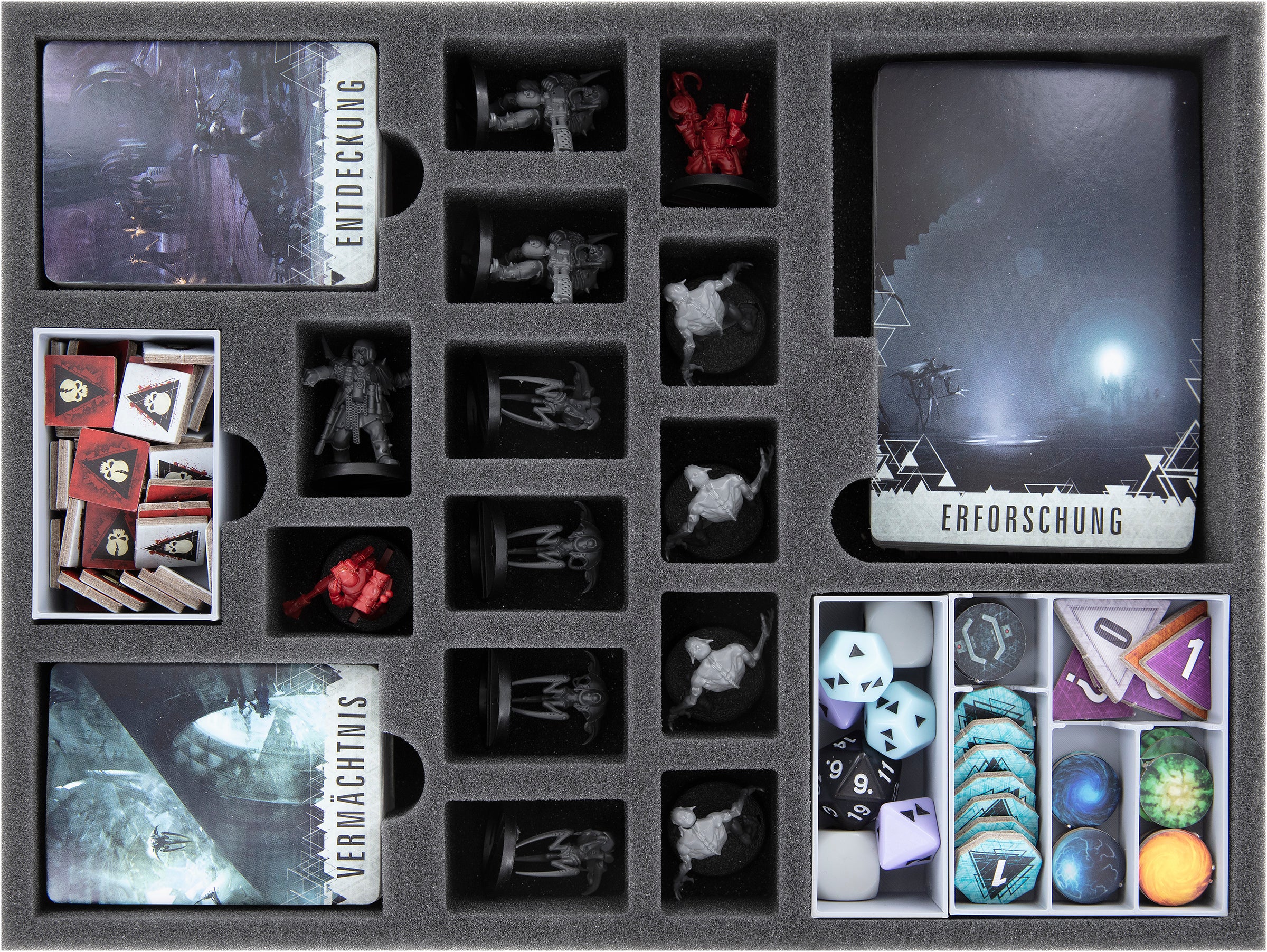 El juego está repleto de maravillosas y detalladas miniaturas y abundante material de juego. Para que tu caja no se convierta en un laberinto y las figuras se pierdan en la oscuridad, aquí tenemos el juego de bandejas de espuma adecuado, con inserciones de plástico incluidas.