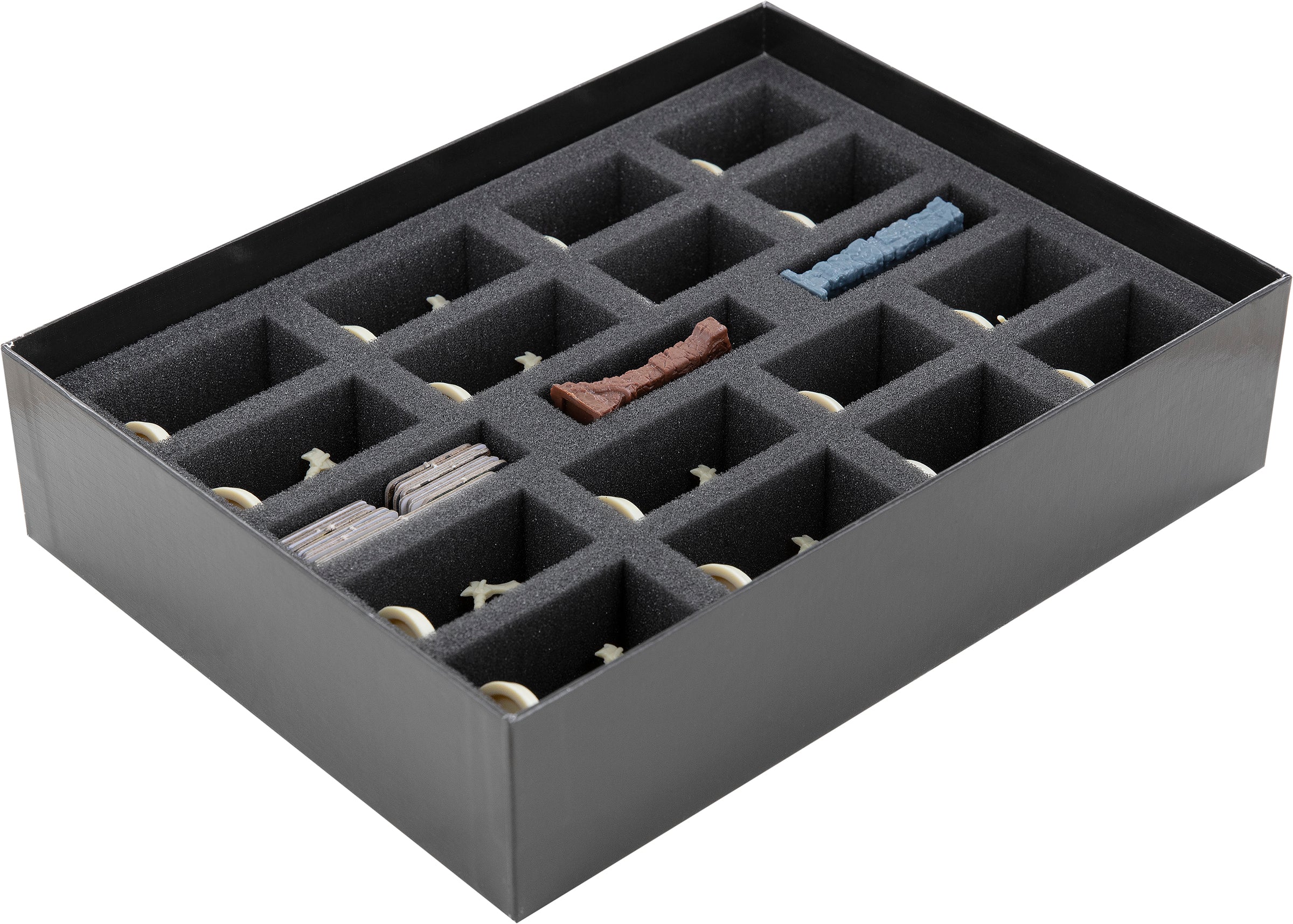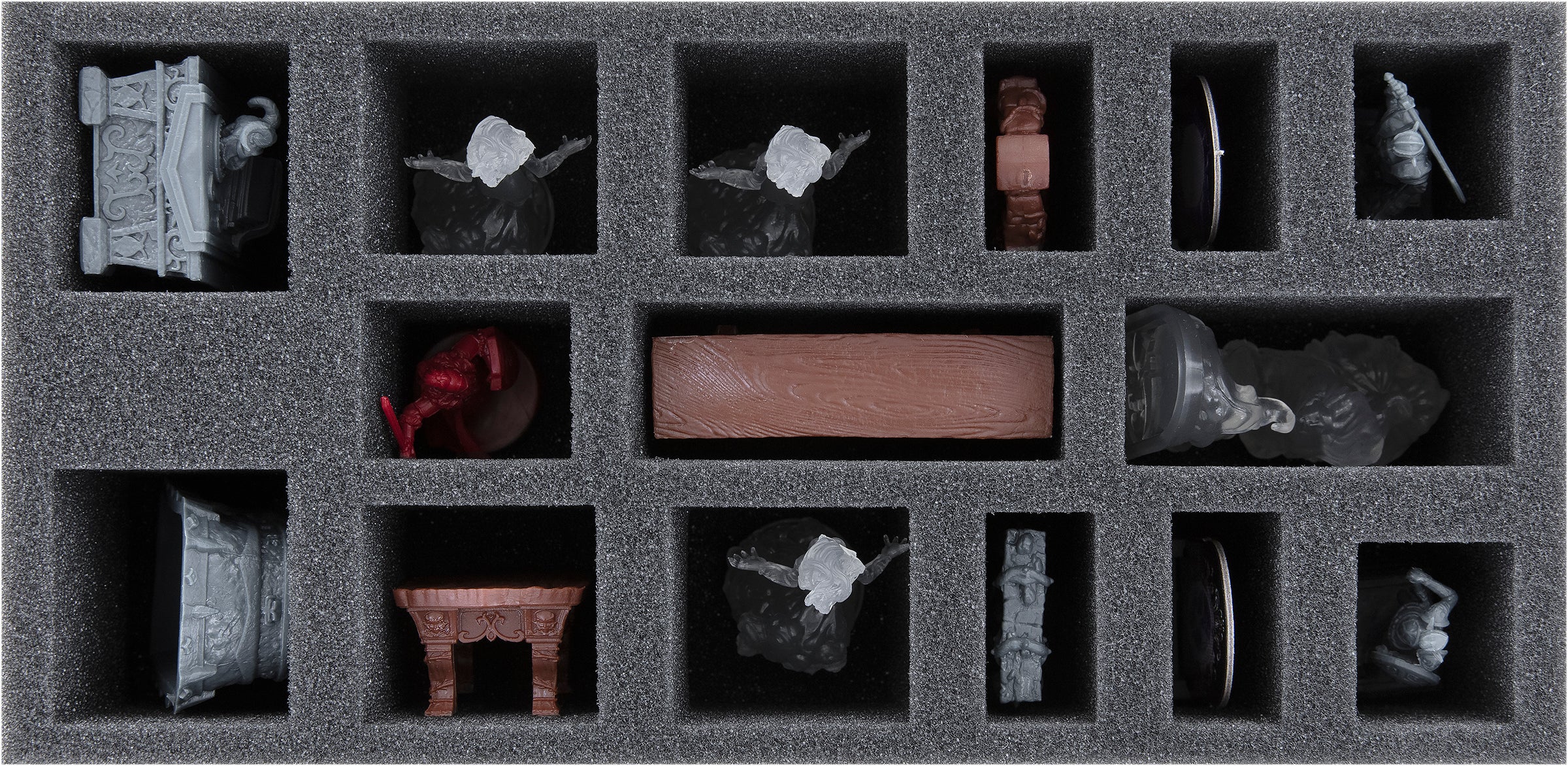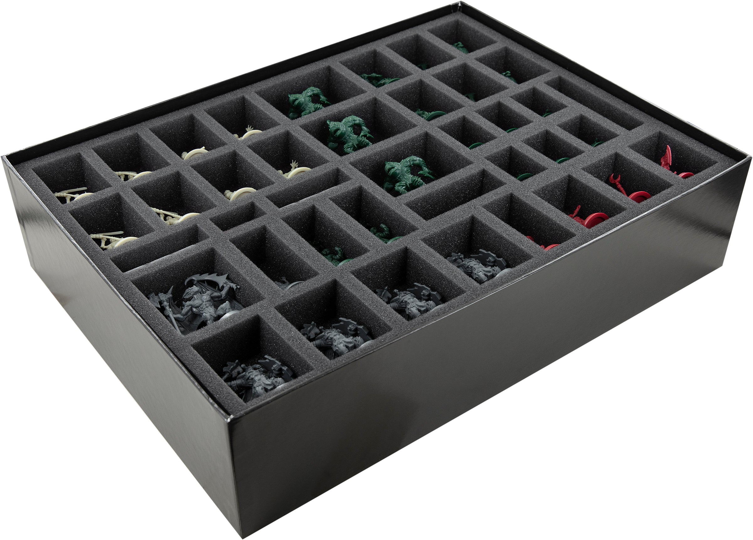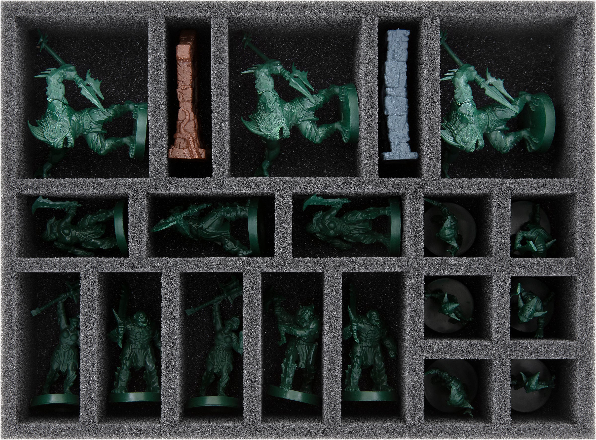 - Tanto si se trata del miniaturas del juego básico como de las expansiones, los bandeja de espuma ofrecen a tus figuras y piezas de terreno una protección fiable, gracias al compartimentos de ajuste personalizado.