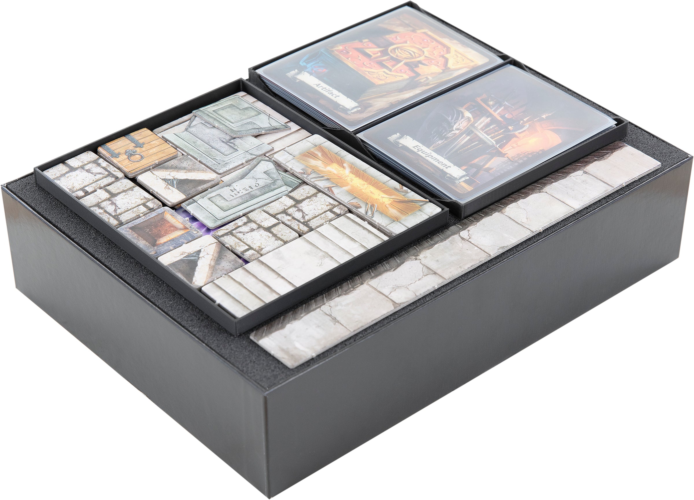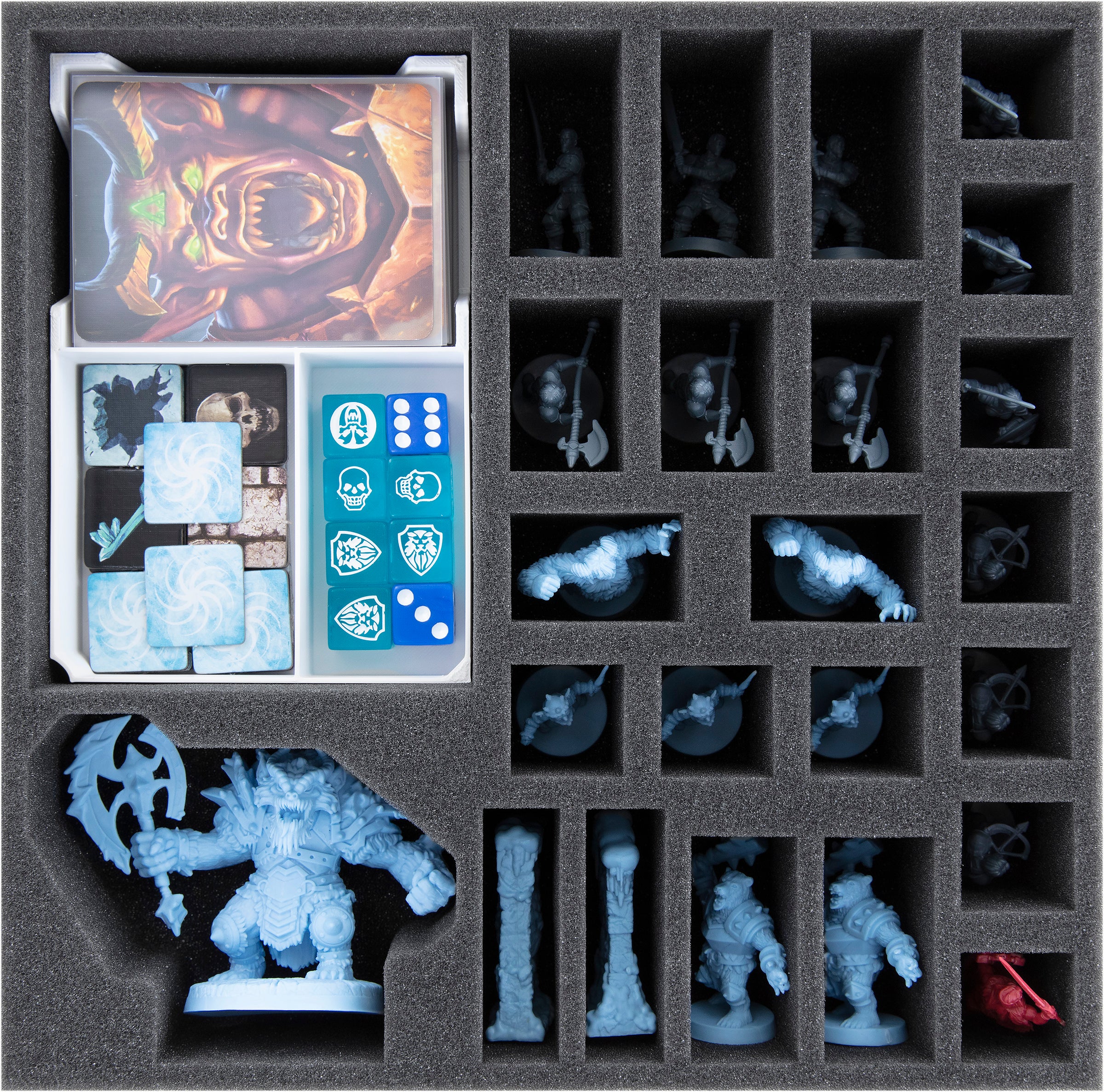Una vez cargados todos los compartimentos, coloca el espuma cubierta sobre los bandeja de espuma.Ahora todos tus miniaturas y material de juego están protegidos con Feldherr espuma de alta calidad por todos los lados.Coloca todos los componentes más grandes del juego, como el libro de reglas, la pantalla, el tablero de juego, el libro de aventuras, la Sala de la Jaula, la Sala del Tesoro del Gremlin de Hielo y el Saliente de Hielo, la Sala del Trono, la Sala Giratoria y las losetas de cartón de gran tamaño encima del espuma cubierta.