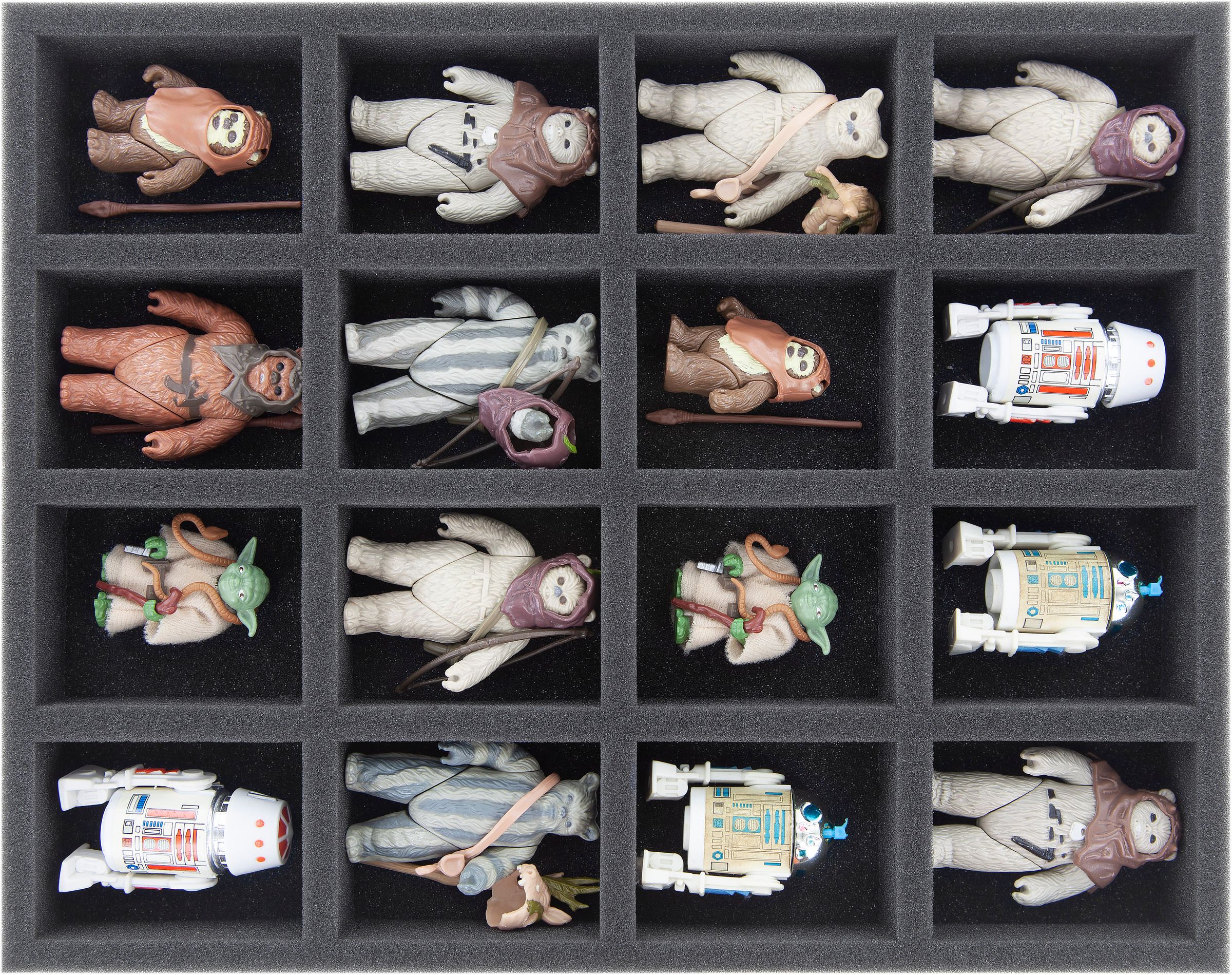 Esta bandeja de espuma Feldherr para Star Wars Vintage tiene 16 compartimentos del mismo tamaño. La bandeja es ideal para el almacenamiento seguro de miniaturas más pequeñas como, por ejemplo, Ewoks, R2D2 o Yoda. La espuma de poros finos proporciona la máxima protección contra daños - las partes frágiles permanecen intactas, las superficies no se rayan.