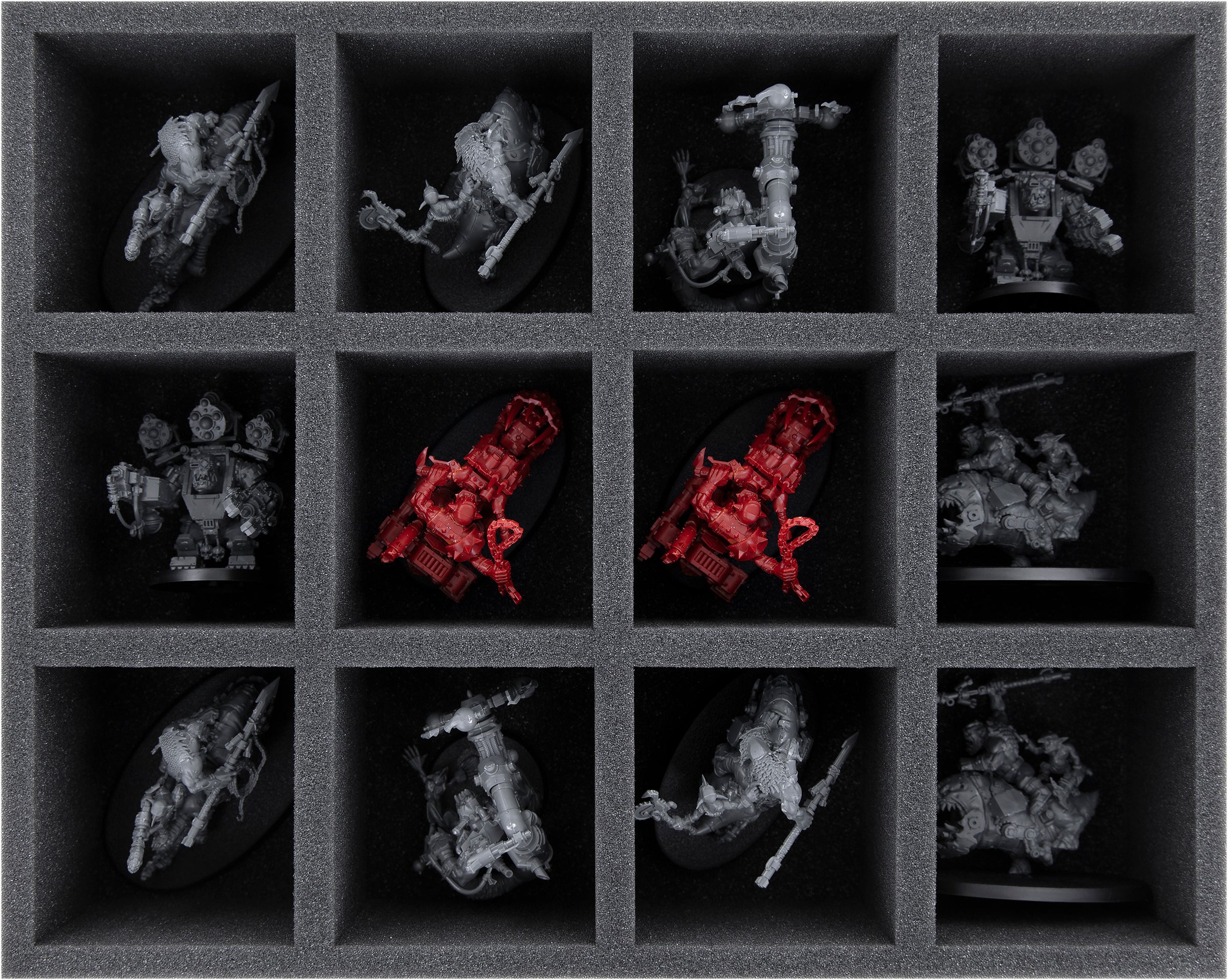 En esta bandeja de espuma Feldherr tienes espacio para hasta 12 miniaturas de tu ejército. El inserto es especialmente adecuado para almacenar a los Squighog Boyz, Big Mek con el cañón de ataque Shokk, Big Mek con Mega Armadura y modelos de tamaño similar.