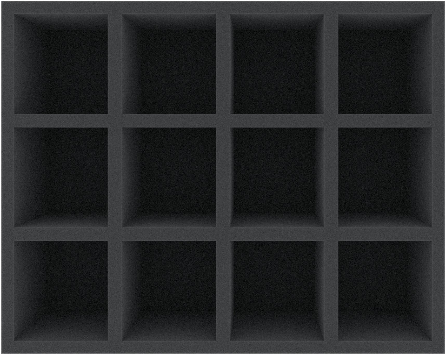Los 12 compartimentos de igual tamaño de esta bandeja de espuma Full-Size sujetan sus unidades en sus bandejas de movimiento de forma segura y ordenada. La espuma suave no sólo protege los detalles sensibles como espadas y lanzas de los daños, sino que también los colores de las miniaturas pintadas están protegidos de los arañazos y la abrasión.