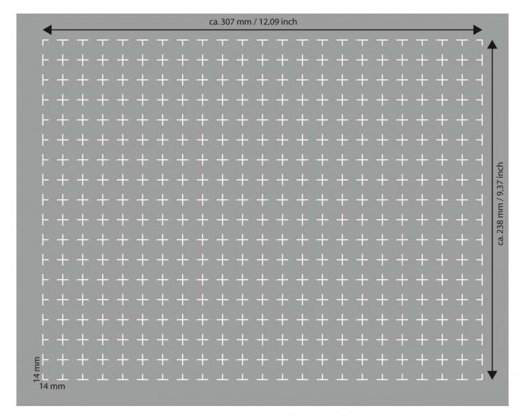 - El cuadrícula preperforado con un tamaño de 14 mm x 14 mm.