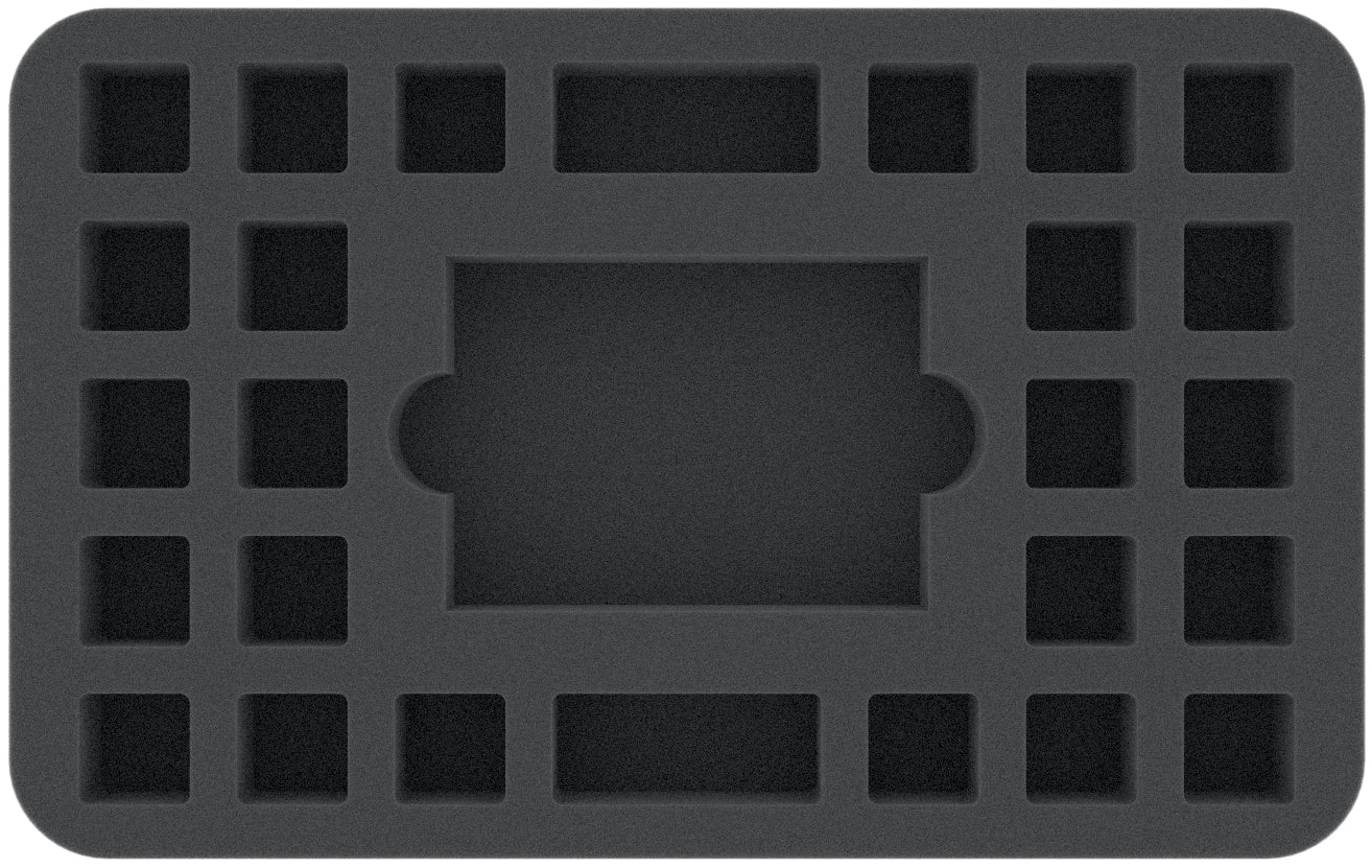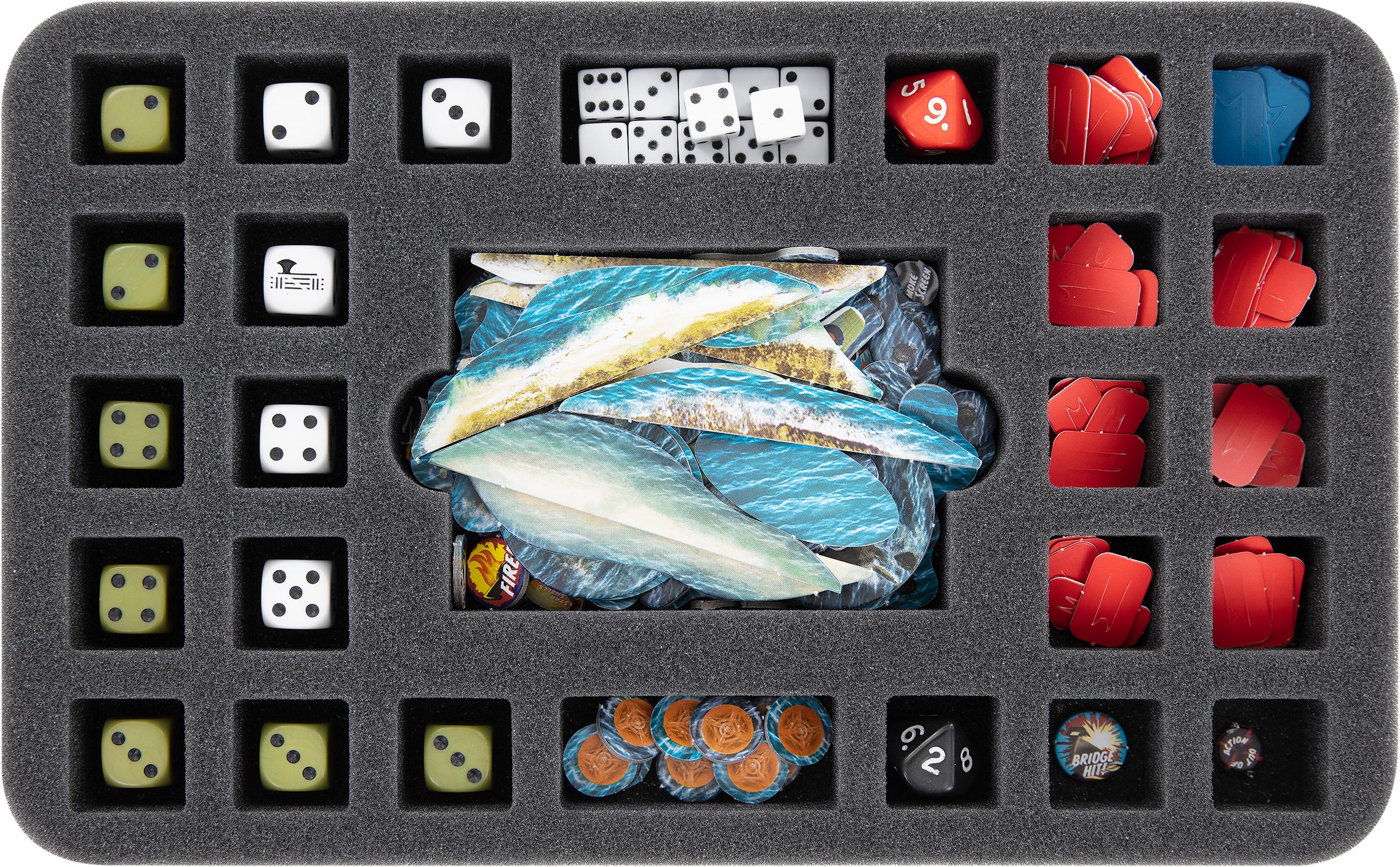 Con esta bandeja de espuma Feldherr podrás guardar ordenadamente los accesorios para Cruel Seas. Los 27 compartimentos del inserto son perfectos para guardar tus dados y fichas. Utiliza los compartimentos grandes para tus fichas de Ola y los más pequeños para los dados y las demás fichas.