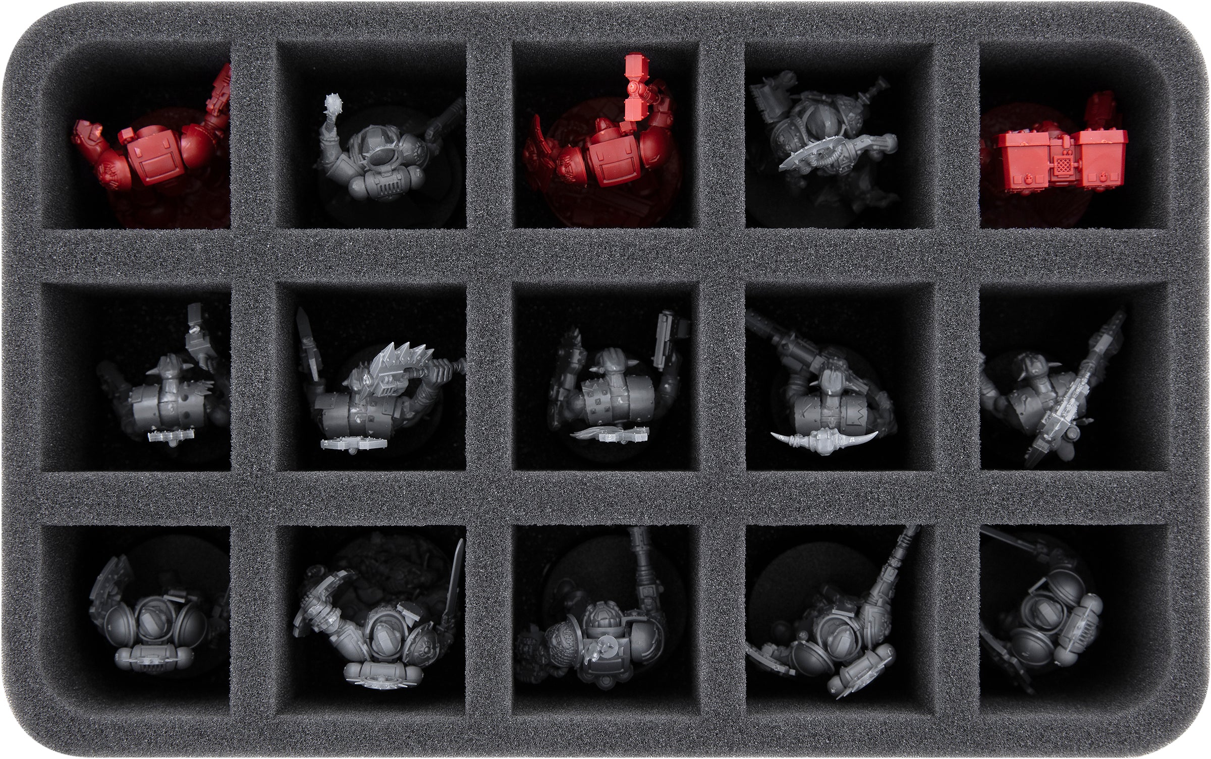 En esta bandeja de espuma Feldherr tienes espacio para hasta 15 miniaturas de tu ejército. El inserto es especialmente adecuado para almacenar los Lootas Orkos, los Boyz Burna o los Boyz Orkos, así como modelos de tamaño similar.
